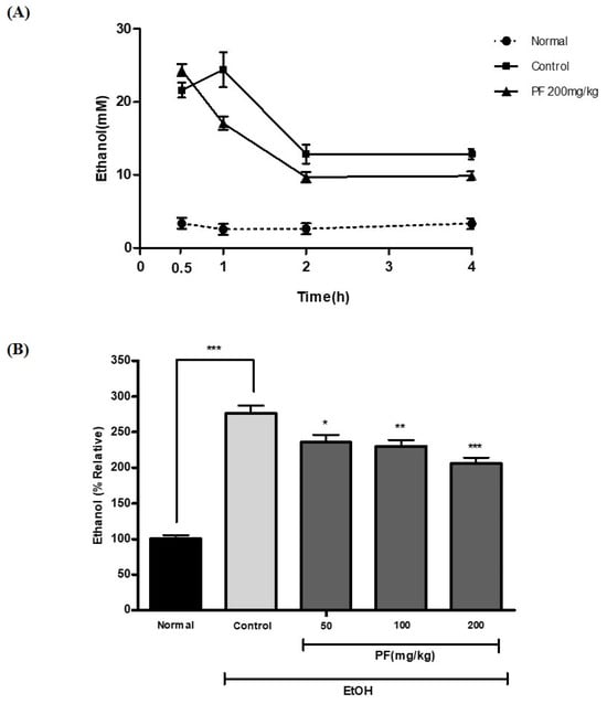 Effects of PF extract on blood alcohol concentration after administration of ethanol in mice. (A) Blood alcohol concentrations at 0.5, 1, 2, and 4 h after ethanol administration (B) Measurement of blood alcohol concentration using PF extract at 50, 100, and 200 mg/kg, respectively. Data are expressed as mean ± SD. * p < 0.05, ** p < 0.01, *** p < 0.005 compared to that of the EtOH group.