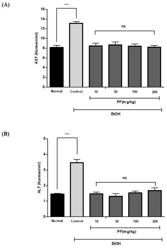3.6. Effect of PF Extract on AST and ALT Levels in Chronic Ethanol-Induced Mice