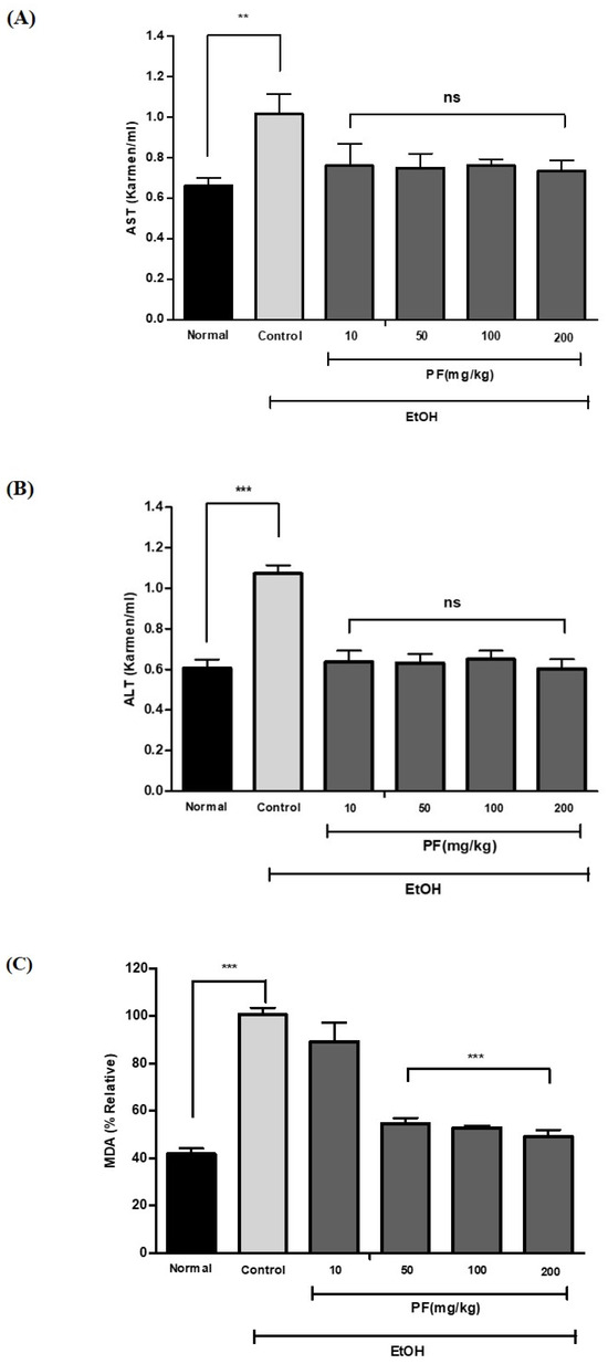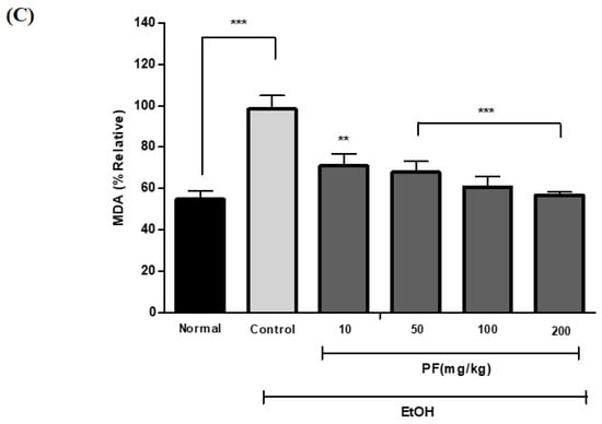 The levels of lipid peroxidation in the liver tissues of mice exposed to chronic alcohol consumption are shown in Figure 4. Compared with the control group, the ethanol-treated group exhibited a substantial increase in lipid peroxidation levels. However, treatment with PF extract at doses of 10, 50, 100, and 200 mg/kg (p < 0.005) in chronic ethanol-induced mouse liver tissues showed a slight concentration-dependent decrease in MDA levels.