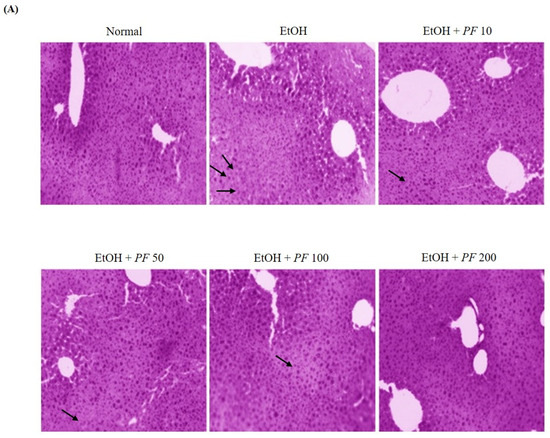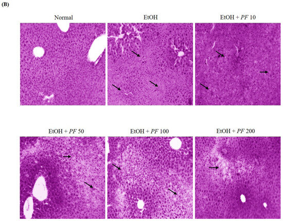 Additionally, the chronic ethanol-induced group was randomly divided into six groups, each consisting of 36 mice (n = 6/group): normal group (oral saline administration), control group (oral ethanol and saline administration), PF 10 mg/kg group (ethanol and PF 10 mg/kg oral administration), PF 50 mg/kg (ethanol and PF 50 mg/kg oral administration), PF 100 mg/kg (ethanol and PF 100 mg/kg oral administration), and PF 200 mg/kg (ethanol and PF 200 mg/kg oral administration). All mouse groups were orally administered daily for 4 weeks, and except for the control group, all groups were administered ethanol daily, beginning 30 min after oral administration of PF for 4 weeks. On the final day of each experiment, fasting and water deprivation were implemented after administration of the final sample and inductor. After an 18 h interval, ether anesthesia was administered and laparotomy was performed to collect blood from the abdominal aorta. The serum was separated by centrifugation at 1500 rpm for 10 min. Liver tissue samples were excised and immediately fixed in 4% paraformaldehyde. The remaining liver tissue was collected and preserved at −70 °C for further experimental protocols.