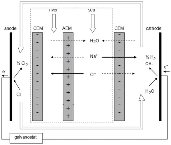 - Veerman, J.; Saakes, M.; Metz, S.; Harmsen, G. Reverse electrodialysis: A validated process model for design and optimization. Chem. Eng. J. 2011, 166, 256–268. [Google Scholar] [CrossRef]