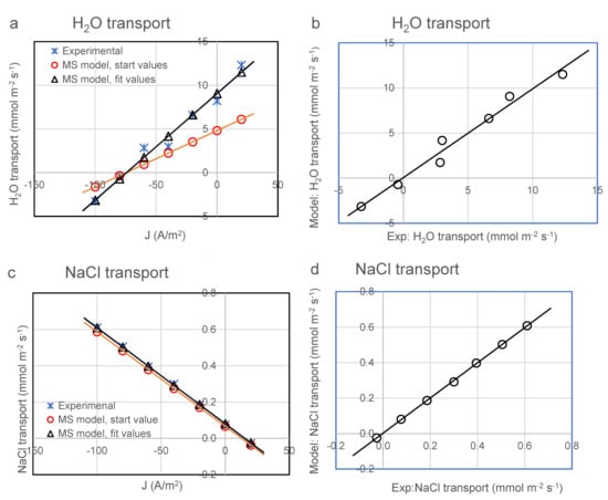 First we adjusted the internal resistance (Ri) only and used the median diffusivities from Table 2. This resulted in relatively poor agreements with experimental values as seen in Figure 3 (marked as ‘MS model, start values’). Then Ri all diffusivities were adjusted until SS reached the minimum SSmin. The same figure illustrates accordance with the experimental values (plots marked with ‘MS model, fit values’). Of interest are the coefficients of determination (R2) between the experimental and modelled data. Table 3 lists the R2 values and the equations of the regression lines from Figure 3b,d,f. The good similarity between the adapted model and the experiment is evident from the high values of R2 and the small y-intercept.