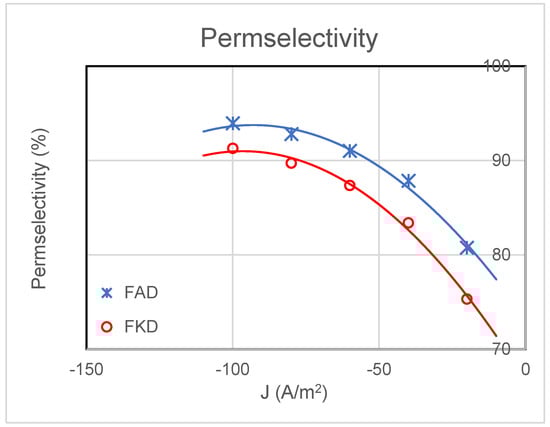 Permselectivities of FAD (*) and FKD (○) membranes as function of the current density.