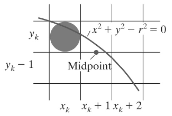 Assuming a known boundary point of a circle at (), the next step is to determine whether the next point is closer to the boundary of the circle at () or (). Then it can be seen that the decision parameters are obtained in the middle of these two points of the circular function equation: