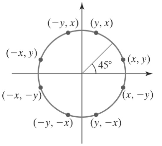Based on the symmetry of the circle, one point is calculated, and seven other points can be determined. For example, if the circle (x, y) is determined, it can be determined that (−x, y), (−x, −y), (x, −y), (y, x), (−y, x), (−y, −x), (y, −x) are also the boundaries of the circle. As shown in Figure 6.