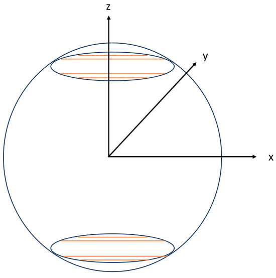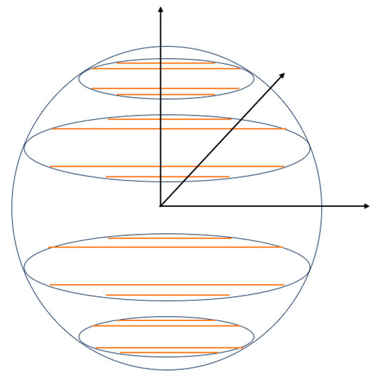 In the inner loop, for each of the above two points, change the symbol to () in the point parallel to the x–y plane. Application of the point circle algorithm can calculate eight points, (, , ) and (, , ), (, −, ) and (, , ), (, , ) and (, , ), and (, −, ) and (, −, ), such that all points are calculated as points in the sphere. Then apply z = −z on the z-axis of the above eight points, and then connect them in pairs. This calculates a total of eight lines, which are located on two discs, as shown in Figure 7.