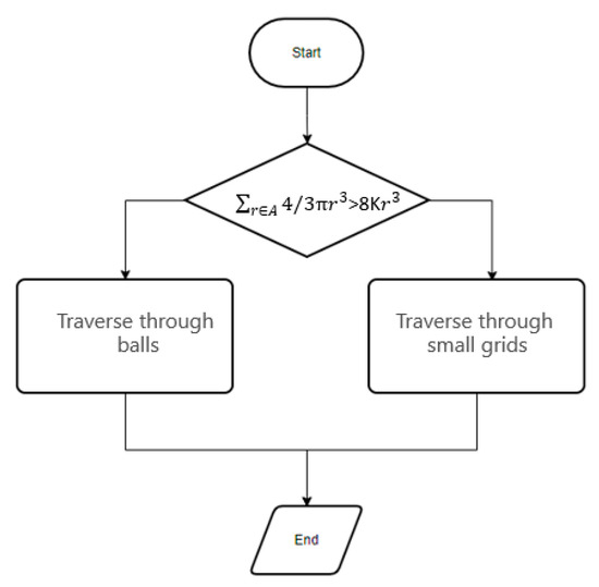 The former is to traverse the small grids occupied by all the small meshes, and the latter is to traverse all the small meshes. Considering time complexity, which algorithm is more efficient depends on the degree of overlap between the balls and the number of balls. If the degree of overlap between ball and ball is high, the former algorithm calculates many duplicate points, resulting in a decrease in efficiency, and conversely, if the degree of overlap is low, its efficiency is higher. The discriminant is . The algorithm flowchart is shown in Figure 9.