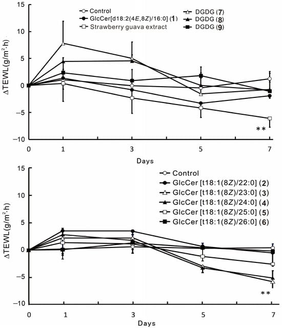 Effects of GlcCers (1–6), DGDGs (7–9), and strawberry guava extract on TEWL in RHEKs. The RHEK model was cultured for 7 days to assess TEWL. TEWL was measured before and 1, 3, 5, and 7 days after the application of treatments. Each value represents the mean ± S.E. (N = 3–4). Asterisks denote significant differences from the control group, **: p < 0.01.