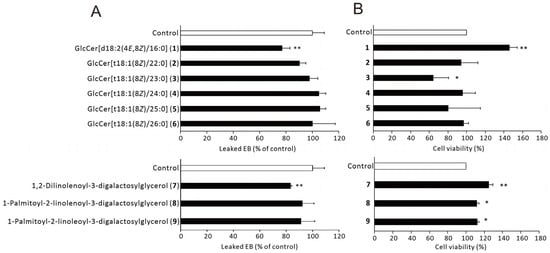 Effects of GlcCers (1–6) and DGDGs (7–9) on dye permeability in the HUVEC layer. (A) The amount of leaked EB from HUVECs. HUVECs were cultured on collagen-coated Millicell® culture inserts for 7 days to form a cell layer. After the pre-culture, the medium was changed to that containing 10 μM GlcCer or DGDG. After a culture for 24 h, the permeability assay was performed. (B) Cytotoxicity test. HUVECs were cultured with 10 μM GlcCer or DGDG for 24 h and MTT assay was performed. Each value represents the mean ± S.E. (N = 3–4). Asterisks denote significant differences from the control group, *: p < 0.05, **: p < 0.01.
