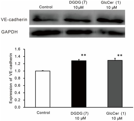 Effects of GlcCer [d18:2(4E,8Z)/16:0] (1) and DGDG (7) on VE-cadherin expression in HUVECs. Each column represents the mean with the SE (N = 3). Asterisks denote a significant difference from the control **: p < 0.01.