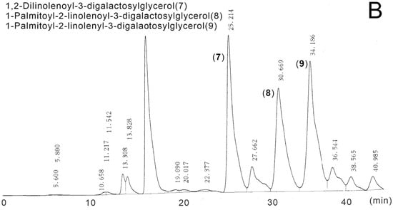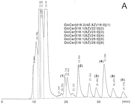 Preparative HPLC chromatograms of GlcCers (A) and DGDGs (B) from strawberry guava fruit.