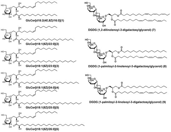 The following supporting information can be downloaded at: https://www.mdpi.com/article/10.3390/pr12071421/s1, Table S1: 1H (400 MHz) and 13C (100 MHz) NMR data of GlcCer 1 (pyridine-d5). Table S2: 1H (400 MHz) and 13C (100 MHz) NMR data of GlcCer 2 (pyridine-d5). Table S3. 1H (400 MHz) and 13C (100 MHz) NMR data of GlcCer 3 (pyridine-d5). Table S4. 1H (400 MHz) and 13C (100 MHz) NMR data of GlcCer 4 (pyridine-d5). Table S5. 1H (400 MHz) and 13C (100 MHz) NMR data of GlcCer 5 (pyridine-d5). Table S6. 1H (400 MHz) and 13C (100 MHz) NMR data of GlcCer 6 (pyridine-d5). Table S7. 1H (400 MHz) and 13C (100 MHz) NMR data of DGDG 7 (pyridine-d5). Table S8. 1H (400 MHz) and 13C (100 MHz) NMR data of DGDG 8 (pyridine-d5). Table S9. 1H (400 MHz) and 13C (100 MHz) NMR data of DGDG 9 (pyridine-d5).
