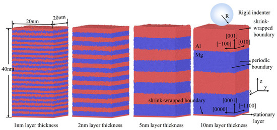 In recent years, there has been considerable interest in multi-layered nanocomposites featuring distinct component layers, primarily due to their excellent mechanical properties such as impact resistance [1,2], abrasion resistance [3,4,5], and excellent strength [6,7]. Among those multi-layered nanocomposites, Al/Mg-layered nanocomposites have potential applications in lightweight aerospace conveying equipment and automotive components [8,9]. However, the thickness of their layers is typically much smaller than the in-plane grain size, and when the thickness diminishes to less than 10 nm, the strength of nanocomposites will be significantly affected by amorphization induced by substantial internal stresses at the interfaces. The small size of nanocomposites has made testing this phenomenon a significant challenge, but the molecular dynamics (MD) method can well observe the contact behavior and interfacial behavior processes of nanocomposites. This method has been widely used in the simulation of materials with various systems [10,11]. For instance, the effect of the amorphization phenomenon under nanoindentation on the deformation behavior and mechanical properties of biphasic high-entropy alloys was studied using the MD simulation [12]. The amorphous layer was found to have a significant effect on the mechanical behavior of high-entropy alloys, acting as an absorber of dislocations and a barrier to their sustained motion. The nanoindentation simulations of crystalline/amorphous nano-laminates were carried out using the MD method, and the thin amorphous layer was found to be an obstacle to the movement of dislocations, while the thicker layer was an obstacle to the sinking of dislocations [13].