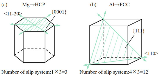The deformation behavior of Al/Mg-layered nanocomposites was simulated using Lammps, the open-source software paeckage (LAMMPS 64-bit, version 3Nov2022-MPI; Sandia National Laboratories: Los Alamos, NM, USA) [20], and the results were analyzed and visualized using Ovito (version Basic 3.8.0; OVITO GmbH: Darmstadt, Germany), a professional and powerful software for visualizing and analyzing atoms and molecules [21]. In this study, the Meam potential function developed [22] was used to simulate the force field. Compared with the embedded atom method (EAM) potential function, it has been proved that the Meam potential function can better describe the crystal elastic behavior [23]. In addition, the simulation iterates every 1 fs. The nanoindentation simulation model for this layered nanocomposite is shown in Figure 1. The thickness of the nanocomposite was determined to be 1 nm, 2 nm, 5 nm, and 10 nm, respectively, and the size of Al/Mg nanocomposite was 20 × 20 × 40 nm. The crystalline structures of the original Al and Mg are shown in Figure 2. The radius of rigid indenter was 6 nm, and the indentation depth was 6 nm. The interface of Al/Mg nanocomposite was incoherent, and its interfacial orientation was set as [001] || [0001]. The width-direction boundary of nanocomposites was a periodic boundary, the indentation plane and the bottom plane were contraction boundaries, and the bottom atom was fixed. The ambient temperature of the simulation process was set to 300 K under the Nose–Hoover method, the energy of the nanocomposite was minimized using the Conjugate gradient method (CG) [24], and the NVT ensemble relaxation model was used for 30 ps [25]. The indentation process consisted of three stages: loading, holding, and unloading. To prevent an interaction between the indentation head and the atoms in the Al/Mg nanocomposite, the indentation head was modeled as a rigid virtual indenter, and the pressure rate was 500 nm/ps.