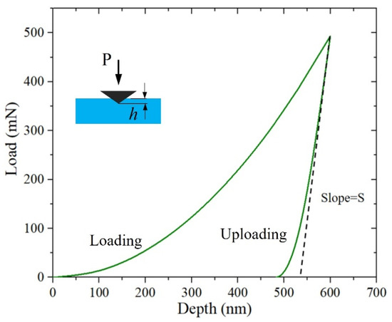 where and represent the modulus of elasticity of the specimen and indenter materials, respectively, while and are their respective Poisson’s ratios. During the nanoindentation process, the load–indentation depth relationship, as shown in Figure 3 [29], can be measured to accurately calculate the hardness and elasticity modulus of material using the Oliver–Pharr method, thereby assessing its mechanical properties. The slope of the curve at the beginning of unloading is the material stiffness, and it can be expressed as [30]