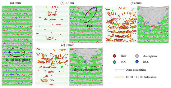 Figure 5a illustrates that the Mg layer of Al/Mg nanocomposite loses most of its crystal structure and becomes amorphous once the indenter contacts the nanocomposite. This transformation is attributed to the sharp increase in internal stress at the Al/Mg interface due to the extremely low layer thickness [35]. Additionally, a small number of HCP atoms in the Mg layer are converted into BCC crystals, indicating that the BCC phase can exist stably under very low layer thickness, as supported by other experimental studies [34]. When the indentation depth reaches 1.3 nm (Figure 5b), the FCC phase appears in the two layers of amorphous Mg atoms below the indenter, aligning with the FCC phase of Al atoms on both sides. Due to significant amorphization at the Al/Mg interface and within the Mg layer, no obvious dislocations or elastic deformations are observed in the Al/Mg nanocomposite [36]. When the indentation depth further reaches 2.8 nm (Figure 5c), the FCC phase further develops in the amorphous Mg layer under pressure, leading to substantial elastic deformation in the layers below the indenter and an increase in mismatch dislocations at the Al/Mg interface. By 6 nm indentation depth (Figure 5d), the proportion of the FCC phase in the Mg atoms increases further, with severe amorphization occurring, resulting in a fully coherent interface between the FCC phase Mg layer and the adjacent Al layer, allowing the Shockley dislocations to pass through the Mg layer [37]. The combination of atomic amorphization due to high pressure and low layer thickness along with the decreased capacity of the interface to hinder dislocations significantly reduces the strength of the Al/Mg-layered nanocomposite [38]. Moreover, the significant elastic deformation between the layers causes the Al/Mg nanocomposite with a 1 nm layer thickness to reach their maximum load at an indentation depth of 4 nm, notably later than composites with other layer thicknesses.