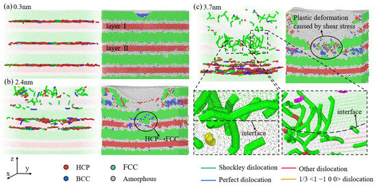 Figure 6a shows that a large number of mismatch dislocations appear at the interface of the Al/Mg nanocomposite with a layer thickness of 2 nm at the beginning. The amorphization of Mg layer atoms decreases significantly compared to the Al/Mg nanocomposite with a layer thickness of 1 nm. The Mg atoms at the interface exhibit an amorphous state, while those in the interlayer maintain the HCP structure. When the indentation depth reaches 2.4 nm (Figure 6b), the atoms in the Mg layer Ⅰ (marked in Figure 6a) directly beneath the indenter gradually transform into the amorphous state. Near the edges of these amorphous atoms, the Mg atoms are transformed into the FCC crystal structure, while those in the BCC phase are mainly distributed at the edge of the layer. In addition, the atoms located directly below the indenter in Mg layer II (marked in Figure 6a) are driven by pressure to transform into the FCC structure, with mismatch dislocations at the interface beginning to cross the FCC lattice Mg layer. When the indentation depth reaches 3.7 nm (Figure 6c), the proportion of the HCP phase in the Mg layer Ⅱ decreases significantly, transforming more into the FCC phase, BCC phase, and amorphous phase. Additionally, the slip direction of the FCC layer directly below the indentation is not perpendicular to the load direction, so there is shear strain distribution. The area most significantly affected by the shear strain is near the indentation, which is similar to the study of Guo et al. [26]. In this process, the orientation of the newly generated FCC phase aligns with the FCC phase in the Al layer, increasing the proportion of the coherent interface and allowing multiple Shockley dislocations to cross the interface [39]. Meanwhile, the atomic layer underneath the Mg layer Ⅱ still contains a large number of mismatched dislocations. Despite the phase transition, the FCC phase transition in the Mg layer of the Al/Mg nanocomposite with a 2 nm layer thickness is not widely distributed throughout the model as in the 1 nm case, being mainly confined to the layer below the indenter. This indicates that when the layer thickness exceeds 1 nm, the initial coherent stress at the interface decreases significantly, insufficient to reach the energy barrier required for amorphization, allowing the HCP phase of the Mg layer to stabilize.