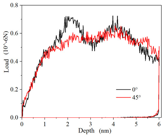 In order to further investigate the relationship between dislocation and phase transition in Al/Mg-layered nanocomposites concerning the Mg crystal orientation, and to enhance the understanding of the plastic deformation mechanism of nanocomposites, the Al/Mg nanocomposite with a layer thickness of 5 nm was examined. The dislocation slip angles were set to 0° and 45°, respectively, to compare the deformation behaviors of the Al/Mg nanocomposite under the nanoindentation at different dislocation slip angles. Figure 8 shows the load-indentation depth curves of the Al/Mg nanocomposite at dislocation slip angles of 0° and 45°, respectively. It was evident that the maximum load on the indenter of the Al/Mg nanocomposite was slightly larger when the dislocation slip angle was 0° compared to when it was 45°. However, the curves of the two are nearly identical in the rising stage of the indenter load, and the difference in the average load during the loading process was not significant. This suggests that, during nanoindentation, the Al/Mg-layered nanocomposite is subjected to localized stresses induced by the indenter, with the strength primarily governed by the Al in the surface layer, and the orientation of the Mg layer has minimal influence on the strength. In addition, when the slip angle of dislocations is 0°, there are two significant stress peaks, which are related to the extension of internal 1/3<1−100> dislocations [41].
