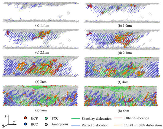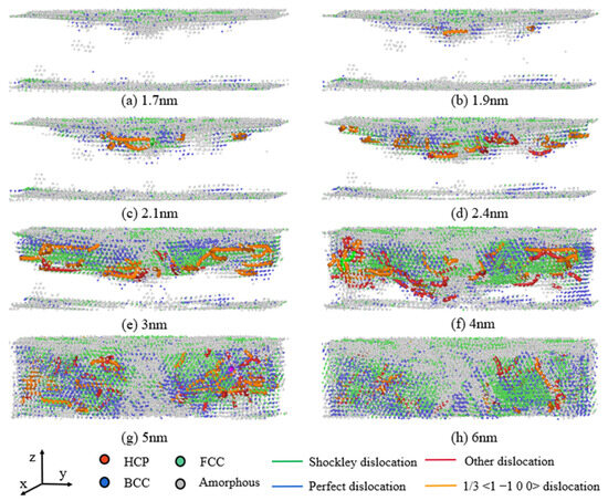 With the increase in the indentation depth, the proportion of amorphous atoms fails to change significantly, and the FCC phase becomes the main phase transformation with the deepening of the indentation, as shown in Figure 9g,h. Once the indentation depth reaches 5 nm, the phase transformation atoms and dislocations have already filled the entire Mg layer, leading to the stable phase transformation independent of further indentation depth. However, the dislocations are no longer strictly parallel to the HCP basal plane {0001}, instead extending to the interfaces on both sides as the indentation deepens. When the indentation depth reaches 6 nm, a complete dislocation traversing the Mg layer is pinned to the interfaces on both sides. This suggests that the original HCP phase in the Mg layer no longer generates new dislocations at this point. Furthermore, the slip direction of the FCC phase generated after the phase transition is not parallel to the interfaces, and although the dislocations in the FCC phase traverse the Mg layer, they are still prevented by the interfaces and fail to extend to the next layer.