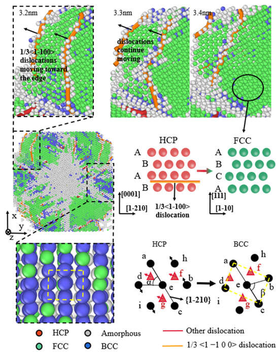 Moreover, the phase transformation during plastic deformation also has a significant effect on the mechanical performance of nanocomposites [14]. Currently, there have been a series of studies on the phase transition behavior during plastic deformation of nanoscale materials. Kou et al. [15] conducted in-situ tensile experiments on pure Ti to study its HCP–FCC phase transition behavior, and found that the mesoscopic sliding of the FCC–Ti phase through the phase boundary was accomplished by conservative gliding of the extended dislocations along the phase boundary. Zhang et al. [16] investigated the deformation mechanism of nano-twinned Al/Ti multilayers using in-situ microcolumn compression tests. They found that the high-density lamellar dislocations and the HCP–FCC phase transition in Ti caused a compressive strength of 2.4 GPa. The mechanism of the deformation-induced phase transition in Ti and the collective behavior of some dislocations were clarified using MD simulations. Zu et al. [17] investigated the effects of surface and orientation on the stress-induced HCP–FCC phase transition in Ti nanopillars by MD simulation and found that the surface and orientation effects were the nanoscale controlling factors for the unconventional phase transition from the HCP to the FCC structure [18]. Sun et al. [19] used the MD simulation to study the phase transition behavior of ultrathin Cu films under uniaxial tensile stress and found that, with the increase in stress, the Cu film underwent successive phase transitions, i.e., FCC to BCC and then BCC to HCP.