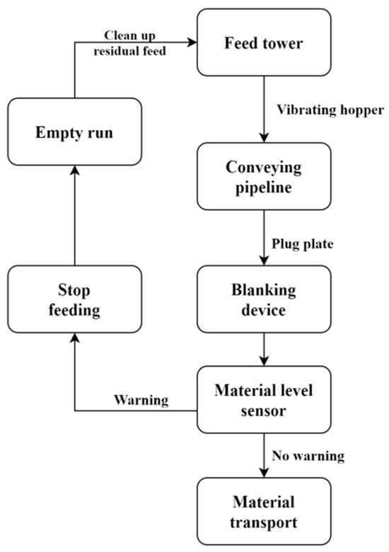 In plug line conveying, the performance of the stopper, the corner wheel, and the material line often affect the stability of the system unit [31]. There are two main types of stoppers: steel buckle and wire rope, and the performance of chain discs connected by steel buckles is more stable than those connected by wire ropes [32]. When the stopper line system starts working, the feed enters the conveying pipe through the vibrating hopper and is accurately conveyed to each drop unit by the push of the stopper. As soon as the level sensor detects that the unit is fully fed, the system stops working and switches to the empty feed operation mode. At this time, the system will clean up the residual feed in the pipeline to prevent it from impacting regular operation.