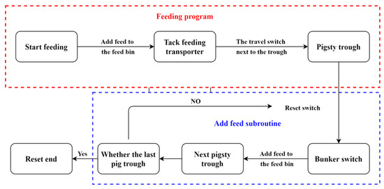 The “Gestalt” feeding system developed by Neadap in the Netherlands for managing lactating sows is mainly based on restriction pens. However, lactating sows kept in restriction pens will be in a state of subhealth for a long time due to the lack of exercise in a small space and will be prone to suffer from reproductive disorders, which is not conducive to the physical health of the lactating sows [73]. The results of the study showed that the Velos feeding system had more significant advantages over the traditional restriction pen feeding system in terms of lowering the duration of labor and reducing the number of weak and stillborn fetuses [74]. Dutch research shows that the Velos feeding system can free lactating sows from restriction pens, freeing them from their herd nature and allowing them to move freely to improve sow health and reproductive performance [75]. The Velos feeding system involves installing chips in the ear tags of group-rearing sows. The chips contains the biological file information of the pig. When the sows want to feed close to the feeder, the equipment uses radio-frequency technology to identify the sow’s ear tags to determine whether the sow is in the estrus stage and then develop a feed delivery program to achieve personalized feeding [76]. The workflow diagram of the Velos feeding system is shown in Figure 5. The management of group-fed sows can satisfy the behavioral expression needs of sows, alleviate their stress response to a certain extent, and improve their reproductive performance.