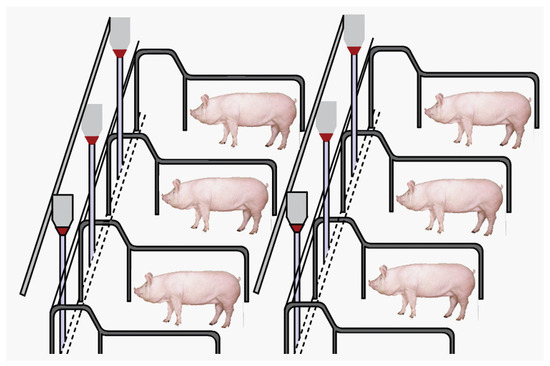 Feed transportation is one of the crucial links in building pig rearing, and the efficiency and stability primarily affect the economic efficiency and biosecurity level of building pig rearing [9]. Traditional feed delivery methods are mainly based on manual transportation, but manual feed delivery has problems such as contamination, cross-infection, and uneven nutrition. Most multi-storey pig farms today use mechanized transport equipment to deliver feed to reduce labor costs and increase the biosecurity level associated with traditional manual breeding.
