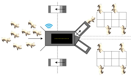 The fattening pig group feeding system designed by Raybolt is a method of grouping fattening pigs in the same batch according to their weight size. In this way, it is possible to individualize the feeding management of pigs with different body weights. This helps to optimize feeding [91]. The fattening pig partitioned feeding system works as shown in Figure 6. When the pig enters the pen splitter, the device will automatically recognize the electronic ear tag on the pig, thus assigning it to different areas for feeding. In the Japanese pig breeding model, fattening pigs with different growth and development conditions are also separated into groups to ensure the balanced growth of the whole group [92]. It has been reported that the survival rate of fattening pigs raised in large pens is at least 2% higher than that of pigs raised in small pens and that it reduces the stress caused by fattening pigs being herded at the time of sale [93]. However, there are some problems with the fattening pig partitioned feeding system.