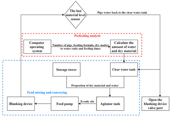 Liquid feeds are mainly used for weaned piglets and sows in the pig industry. Compared with solid feeds, liquid feeds help to improve the gastrointestinal condition of weaned piglets and sows, increase their daily feed intake, and relieve their stress [103,104]. Liquid feed was first used in Europe; so far, 30–60% of the feeding systems have adopted liquid feeding technology [105]. The intelligent liquid feed system comprises computer program control, batching and mixing, and conveying. The system is mainly computerized to accurately calculate the total amount of liquid required for each feeding circuit. Subsequently, according to the feeding formula, each feed ingredient tank proportionally conveys the ingredients to the mixing tank for mixing, and the mixed liquid feed is accurately conveyed to each discharging tank through the feeding pumps [106]. Its workflow is shown in Figure 7. When piglets are first weaned, many factors may adversely affect the intestinal tract, decreasing brush border enzyme activity and absorption capacity, indicating the piglet’s digestive capacity and decreasing daily feed intake [107,108]. Although liquid feed is more advantageous than traditional dry feed in promoting pig growth and improving feed conversion ratio, it has some problems, such as extended response time, significant errors in feeding accuracy, and the deterioration of residual feed [109].