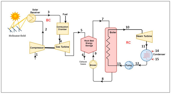 The newly developed combined cycle power plant (CCPP) features a primary solar Brayton cycle (SBC), a secondary Rankine cycle (RC), and rock bed thermal energy storage (RBES). This research focused on the Neom region in Saudi Arabia. Figure 1 illustrates the CCPP system, which utilizes both solar and fuel energy. The SBC includes an air compressor, heliostats, solar receivers, a combustion chamber, and a gas turbine. The air compressor increases air pressure to 1469 kPa, which is then heated by a solar central receiver. The combustion chamber adjusts for solar light variations, maintaining the gas turbine’s inlet temperature at 1000 °C using a small amount of CH4 fuel for enhanced efficiency. Exhaust gases from the SBC pass through the RBES, storing energy during the day and enabling the RC to generate power at night without solar radiation. The RC uses hot exhaust gases from the GT stored in the RBES and benefits from the hot air produced by the RBES. The SBC operates for 10 h during peak solar radiation, storing hot exhaust in rocks. The remaining 14 h are used to run the Rankine steam cycle, with the system generating power from the SBC for 10 h and from the RC for 14 h. The temperature profile through the boiler is illustrated in Figure 2.