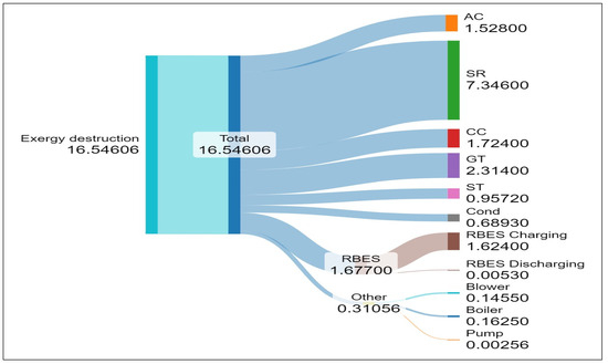 Exergy destruction inside the CCPP components under ideal operating circumstances is explained in Table 7 and Figure 4. High-temperature variances correlate with more significant exergy destruction. Solar receivers experience the most significant temperature difference, and they exhibit the highest destruction rate, amounting to 7.346 MW. GT and CC also contribute significantly to the overall destruction, accounting for 13.98% and 10.41%, respectively. Figure 3 highlights the pronounced exergy destruction in the GT. This phenomenon is attributed to the impact of hot air on its turbine blades. Rock bed energy storage (RBES) contributes 10.13% due to charging and discharging processes. AC, condensers, and ST played roles in the overall destruction. The pump exhibits minimal contributions. The boiler achieves an impressive exergy efficiency of 97.6%. These findings shed light on the intricate dynamics of exergy destruction and utilization within the system.