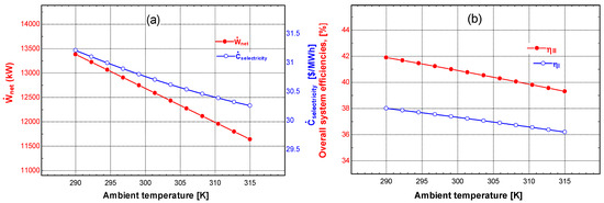 Figure 5a,b illustrate the influence of ambient temperature () on various performance metrics. As () increases, a decrease is observed in the network output , the system power cost rate , the overall system efficiency (), and the second-law efficiency (). This trend is mainly attributed to the rising enthalpy () and the power consumption of the air compressor with increasing . A portion of powers the compressor, and the rise in negatively impacts both the and overall efficiencies. Figure 5a quantifies this effect, showing a decrease in from 13,382 kW to 11,641 kW when increases from 290 K to 315 K. When the ambient temperature decreases, both the work consumed by the compressor and the exit temperature of the compressor decrease. Consequently, the air temperature entering the combustion chamber also decreases. This decrease in inlet temperature increases the cost of exergy destruction in the combustion chamber and the entire cycle, which raises the specific energy cost. Figure 5a highlights this trend, with decreasing from 31.21 USD/MWh to 30.26 USD/MWh as increases from 290 K to 315 K. Furthermore, Figure 5b demonstrates the corresponding decline in efficiencies. , representing the system’s overall efficiency, decreases from 38.01% to 36.2%, and , reflecting the second-law efficiency, decreases from 41.9% to 39.31%.