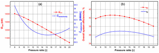 The impact of pressure ratio (PR) changes on the system’s work output, power cost rate, and overall efficiency.