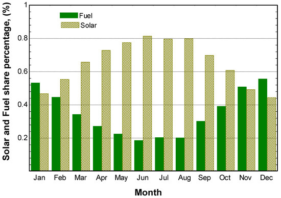 Figure 8 depicts how the sun and backup fuel contribute to the CCPP’s yearly heat supply. The data reveal that the summer months benefit from the sun’s increased intensity, with solar energy providing a whopping 81.42% of the heat in June. Conversely, the winter presents a different version. Due to lower solar radiation, the system relies heavily on fuel for heat, with solar only accounting for 44.41% of the needs in December. In essence, the sun plays the leading role in heat generation during the summer, while fuel becomes more crucial in the winter.