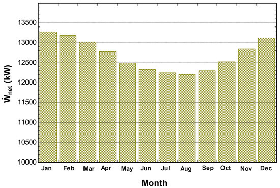 Figure 9 illustrates the CCPP’s power output variation across the year. Interestingly, January sees the highest power generation, reaching 13,276 kW. This can be attributed to two factors. First, fuel delivers higher quality energy compared to solar energy. Second, colder environments favor the gas turbine cycle’s efficiency. Due to these reasons, the system produces more power in January than in August, which sees a lower output of 12,206 kW.