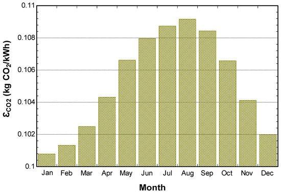 The emission rate () measures the amount of that is emitted into the atmosphere as a result of human activities [45,46]. The value of for electricity production is calculated by dividing the total amount of emissions produced during a certain period of time by the total amount of energy generated during the same period. The rate is calculated using the following equation [47,48]: