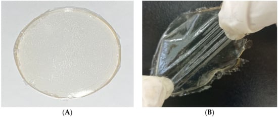 A visual qualitative evaluation was performed on the hydrogels with incorporated nanocrystals and nanofibres. In this analysis, complete solubilisation of carboxymethylcellulose occurred, as characterised by the clear and transparent appearance of the hydrogels (Figure 1A). After the hydrogels were dried, a smooth, homogeneous and transparent hydrogel was observed (Figure 1). In the case of hydrogels with vitamin D, a more flexible film was observed, which was also translucent and homogeneous (Figure 1B). This can be justified by the fact that vitamin D also cross-linked the hydrogel, enabling greater elasticity of the hydrogel, although future mechanical analysis is necessary to evaluate this elasticity.