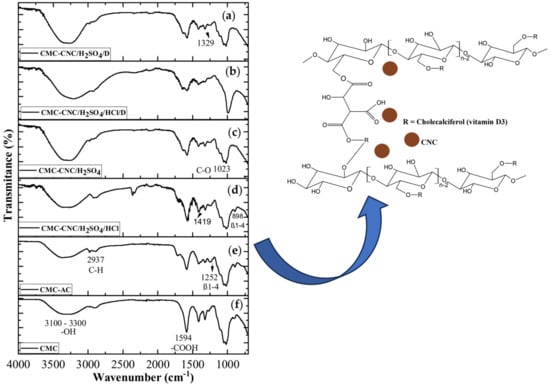 FTIR spectra of the (a) CMC, (b) CMC-AC, (c) CMC-CNC-H2SO4, (d) CMC-CNC_H2SO4/HCl, (e) CMC-CNC-H2SO4/D and (f) CMC-CNC-H2SO4/HCl/D hydrogels (inset, schematic of the chemical linkage in the hydrogel with vitamin D).