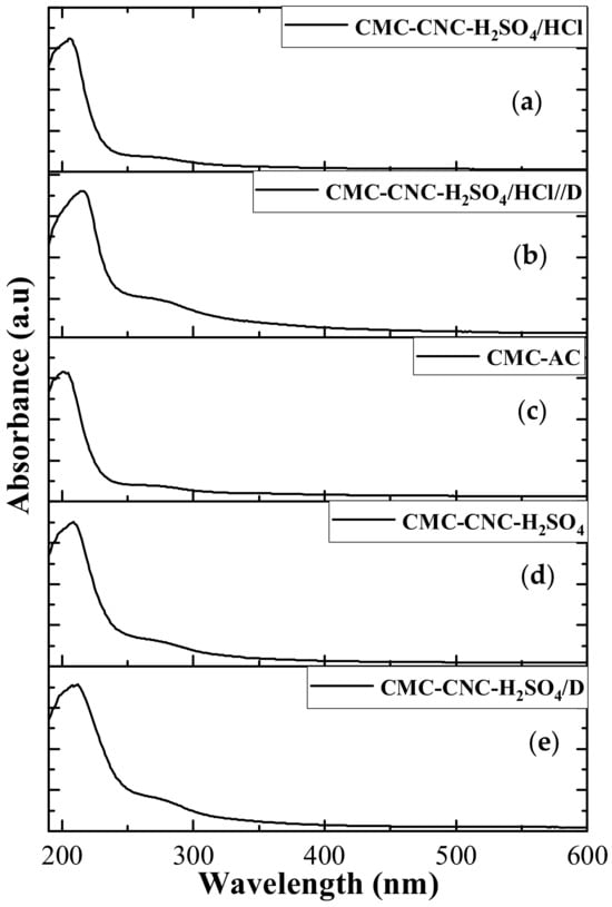 UV-VIS spectra of the (a) CMC-CNC-H2SO4/HCl, (b) CMC-CNC-H2SO4/HCl/D, (c) CMC-AC, (d) CMC-CNC-H2SO4 and (e) CMC-CNC-H2SO4/D hydrogels.