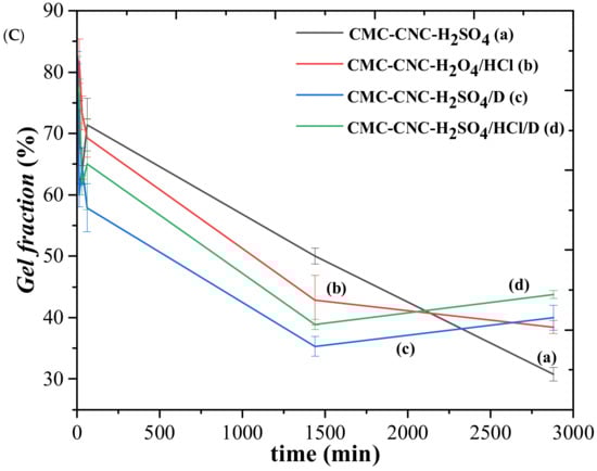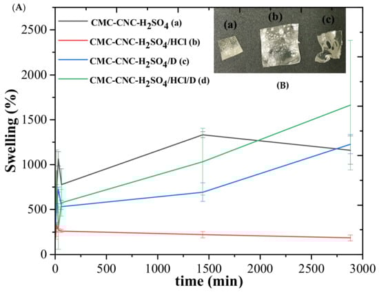 (A) Swelling of hydrogels (a) CMC-CNC-H2SO4, (b) CMC-CNC-H2SO4/HCl, (c) CMC-CNC-H2SO4/D and (d) CMC-CNC-H2SO4/HCl/D. (B) Photography of hydrogels with vitamin D (a) before swelling, (b) after swelling and (c) after gel fraction. (C) Gel fractions of hydrogels (a) CMC-CNC-H2SO4, (b) CMC-CNC-H2SO4/HCl, (c) CMC-CNC-H2SO4/D and (d) CMC-CNC-H2SO4/HCl/D.
