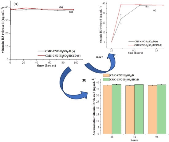 (A) Kinetics of vitamin D3 release in vitro over time in (a) CMC-CNC-H2SO4/D and (b) CMC-CNC-H2SO4/HCl/D hydrogels; (B) cumulative vitamin D released at 48, 72 and 96 h in both hydrogels with vitamin D (CMC-CNC-H2SO4/D and CMC-CNC-H2SO4/HCl/D) (inset shows the vitamin D3 release from the two hydrogels in the first 30 min).