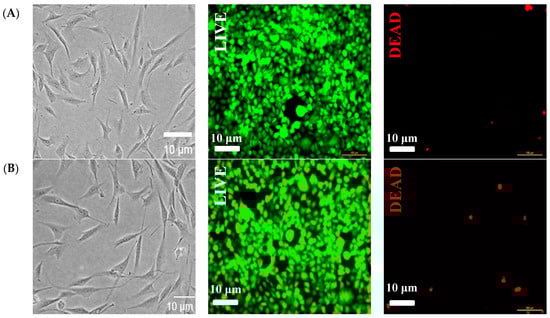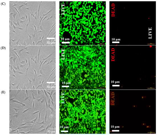 Additionally, LIVE/DEAD® Viability/Cytotoxicity was used. The HDF cells at passages 13 and 8 were synchronised in serum-free medium for 24 h. Sequentially, the cells were trypsinised, seeded (3 × 105 cells/well) on hydrogels (1 mg of hydrogel and 200 µL of medium, w/v) and placed in a 96-well plate. The reference controls were cultured in DMEM supplemented with 10% FBS. Subsequently, all the media were aspirated, and the cells were washed twice with 10 mL of PBS (Gibco BRL, NY, USA). The cells were treated with the LIVE/DEAD® kit (Life Technologies of Brazil Ltd., São Paulo, Brazil) for 30 min according to the manufacturer’s specifications. Images of fluorescent emissions were acquired with an inverted optical microscope (Leica DMIL LED, Wetzlar, Germany) and revealed calcein at 530 ± 12 nm and EthD-1 (ethidium homodimer-1) at 645 ± 20 nm.