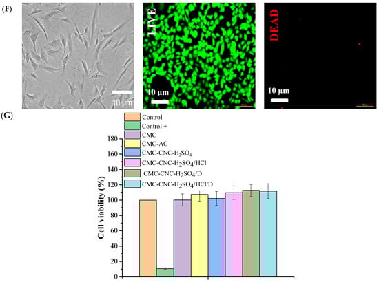 (A) Micrographs and LIVE/DEAD® assays of HDFs after 168 h of incubation (live cells (green) and dead cells (red) in the control group at 200× magnification) with (A) CMC, (B) CMC-AC, (C) CMC-CNC-H2SO4, (D) CMC-CNC-H2SO4/HCl, (E) CMC-CNC-H2SO4/D and (F) CMC-CNC-H2SO4/HCl/D. (G) Histogram of the viability of HDFs in the presence of all hydrogels and in the control groups.