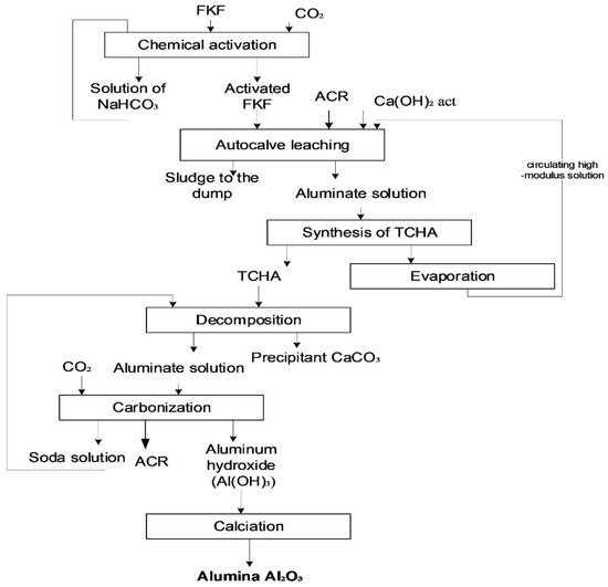 According to the developed technology (Figure 8), further processing of the aluminate leaching solution to obtain is associated with carrying out operations under the specified conditions for the synthesis of tricalcium hydroaluminate (TCHA), its decomposition in a soda solution to obtain an aluminate solution for the carbonization separation of Al(OH)3 and its calcination. The waste sludge obtained as a result of leaching can serve as a raw material for construction materials.