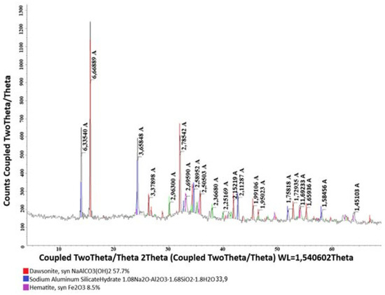 As a result of chemical activation, the original aluminum-containing phases gibbsite and kaolinite disappear with the formation of dawsonite, sodium hydroaluminosilicate and boehmite. The complete disappearance of gibbsite and kaolinite occurs at a duration of 90 min. Due to the fact that, according to X-ray phase analysis data, quartz was not included in the composition of the new phases, we can conclude about its transition to the X-ray amorphous state. The chemistry of the formation of new phases can be represented in the form of the following equations: interaction of gibbsite with sodium hydrogen carbonate to form dawsonite (1) and interaction of kaolinite with sodium hydrogen carbonate to form sodium hydroaluminosilicate (2):