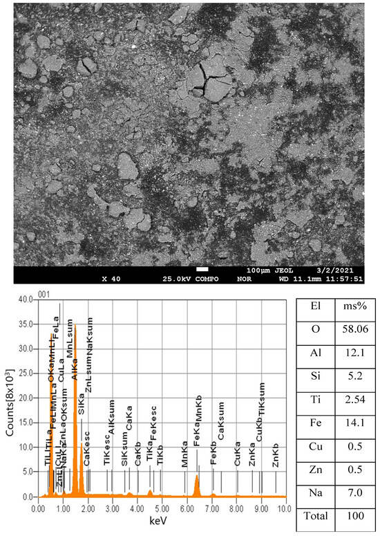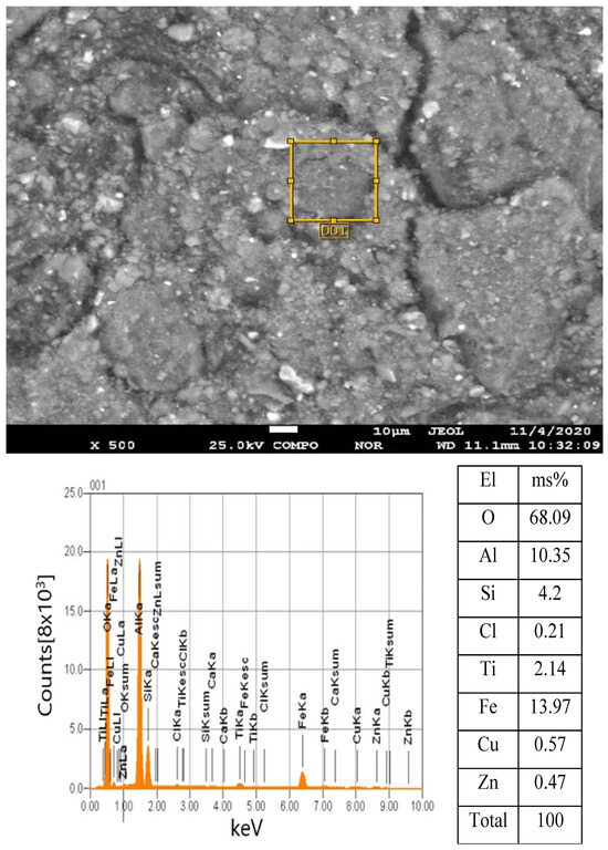 Scanning electron microscopic analyses of FKF after chemical activation (Figure 5) confirmed the presence of Na2O in its material composition. Visually, it is possible to observe the loose structure in comparison with the initial one (Figure 4). In Figure 4, the sample is represented by clay lumps in which kaolinite is the binder.