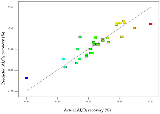Experimental and predicted leaching efficiency. The color difference in the square shows the recovery of Al2O3 from low (green) to high (red).