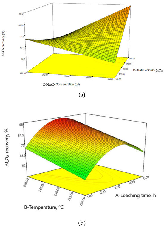 All the fixed parameters used were the values of the mean point and the relevant interaction parameters versus the response. Figure 7a shows that for a fixed leaching time and temperature, decreasing the Na2O concentration and increasing the CaO/recovery ratio increased the Al2O3 recovery efficiency. Figure 7b shows a maximum recovery of Al2O3 of 87.5%, at which three parameters were adjusted, and the leaching time set with these values was observed [24].