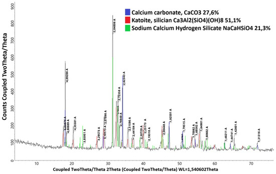 X-ray fluorescence spectra were determined with a Venus 200 spectrometer with wave dispersion (PANalyical B.V., Holland, (PANalyical, Almelo, The Netherlands)). Chemical analyses were performed with an optical emission spectrometer with inductively coupled plasmas (Optima 8300 DV, PerkinElmer, Waltham, MA, USA). The random errors were 2.0%. X-ray diffraction studies were performed with a D8 Advance instrument (Bruker, Billerica, MA, USA) with Cu Kα radiation at 40 kV and 40 mA. Chemical activation of the FKF was carried out via thermochemical treatment [15] in a solution containing 120 g/dm3 NaHCO3 at a temperature of 200 °C for 60–90 min. After chemical activation, hydrochemical leaching of the FKF was carried out with the addition of active calcium oxide in an aluminous alkaline solution (g/dm3: Na2Otot 245.0; Na2Okaust 11.4; Al2O3 13.43; temperature 220–280 °C, duration 1.0–6.0 h, ratio L:S = 4:1 and ratio CaO/SiO2 = 1.0–2). Leaching was carried out in an autoclave with constant mechanical stirring. The active form of calcium oxide was prepared by obtaining a finely dispersed powder of slaked lime in a solution containing 20 g/dm3 Na2SO4 at a temperature of 200 °C for 2 h [14].