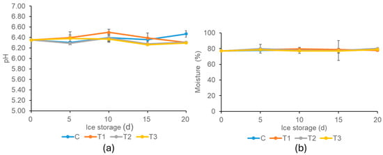The behavior of pH (a) and humidity (b) in tilapia fillets (Oreochromis niloticus) in ice storage. C (control); T1 (30 min of HIU); T2 (60 min of HIU); T3 (90 min of HIU). The values are the average of n = 3 ± standard deviation.